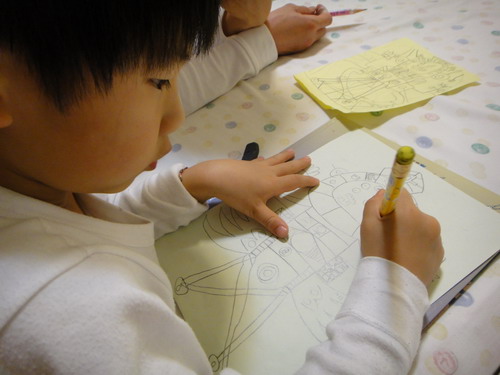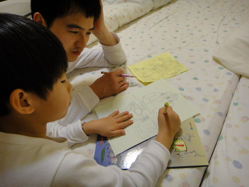 厚...真是認真到不行,洗完澡還拉著爸比陪他繼續畫...