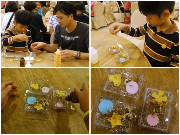 咱們家選擇了手工皂DIY,材料有檸檬香精、橄欖油、乾燥桂花及菊花、造型皂及皂液等