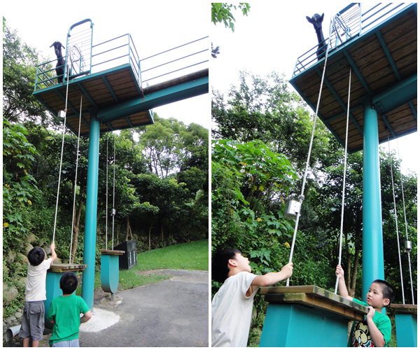 有個餵法很有趣,要把飼料放在鐵杯裏,然後拉上去給天橋上的小羊吃,這隻訓練有素的