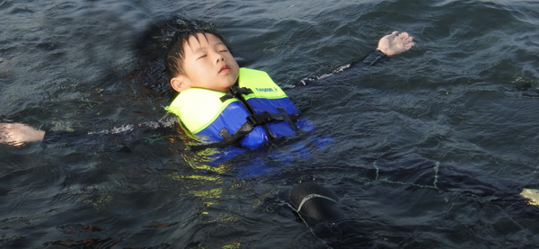 有了救生衣,賢子很輕鬆的享受在大海上隨浪飄浮...