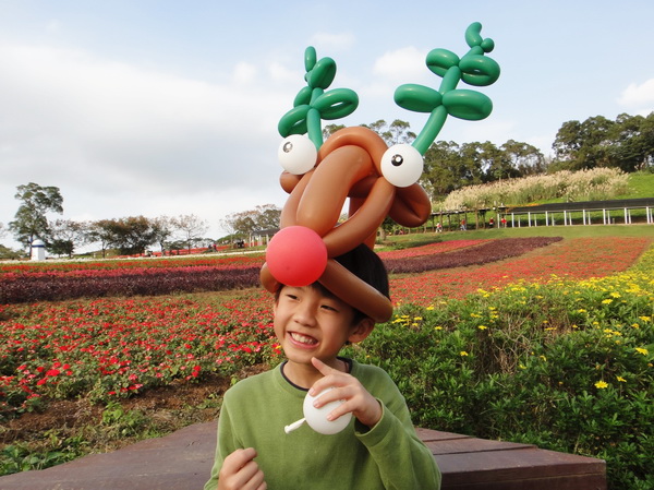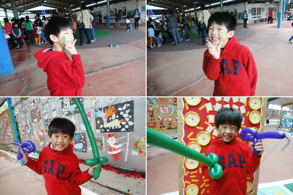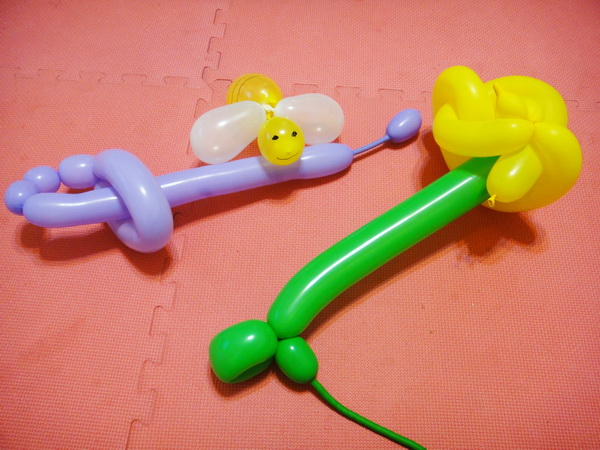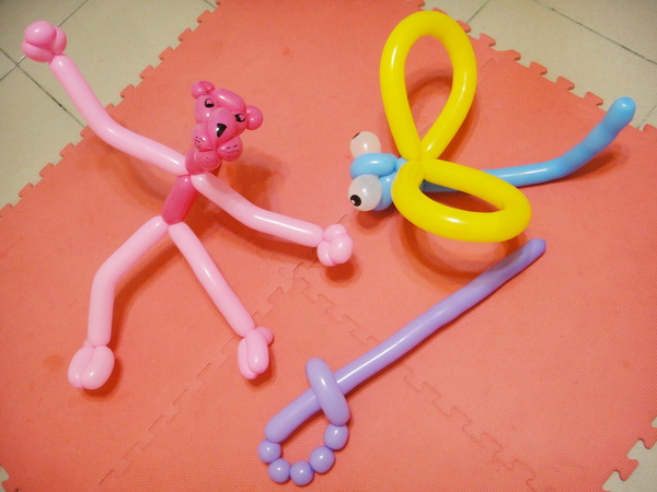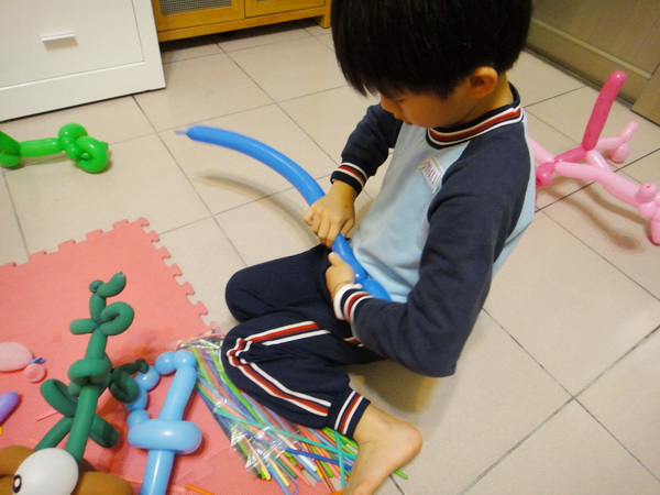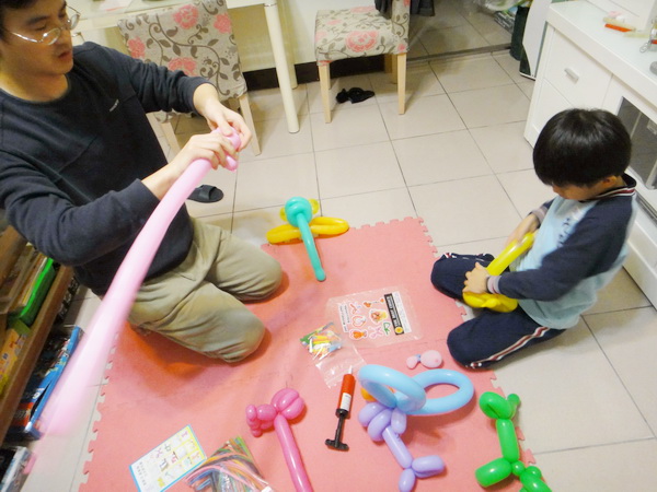 爸比在研究造型氣球,賢子也在一旁折了起來,厚....下手之狠,都不怕弄破氣球咧...