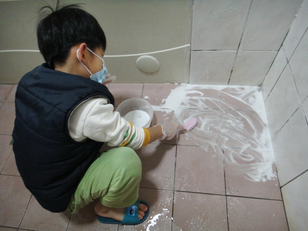 大掃除幫忙洗廁所,戴上口罩及手套,全副武裝後,刷沒二下竟然就藉口溜掉....抓回來