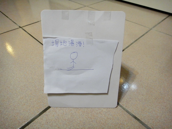 後改做簡單的拖地板,總算拖完,還做了個『場地濕滑』的警告牌....這小子花樣真多....