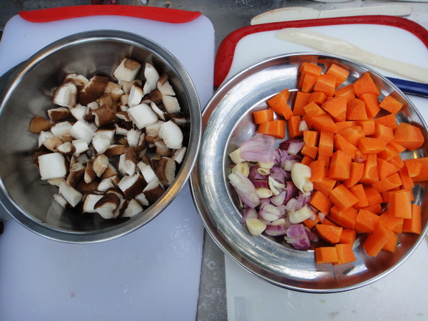 開始處理食材囉~我們大人只在旁邊口頭指導,絕不插手.....先將紅蘿蔔和香菇切成小塊