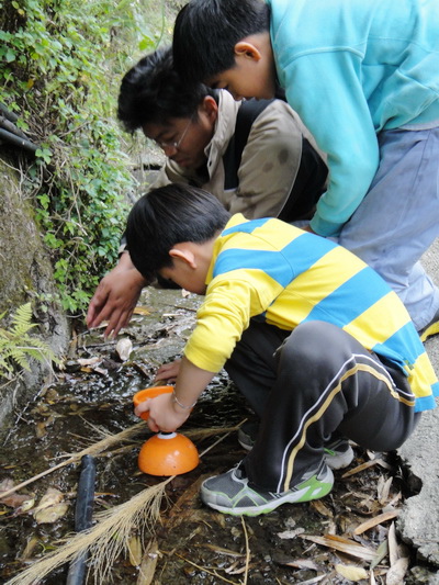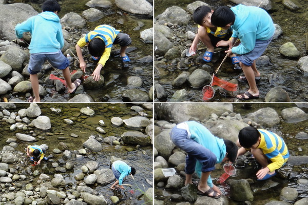 走著走著被路旁的小水流吸引了....因為發現裏面好多隻小小蝦,小古及哼哈二將又開始