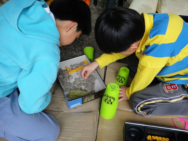 二個小傢伙正在逗他們的新朋友-小蟋蟀