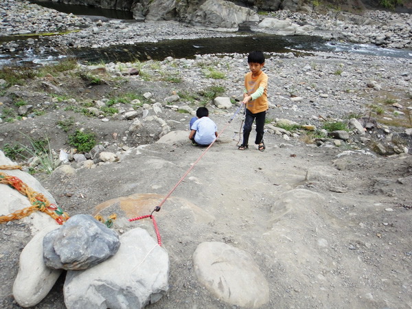 要通過斜坡才能下達溪邊,小子們立刻自製了一條攀爬繩索,方便進出........