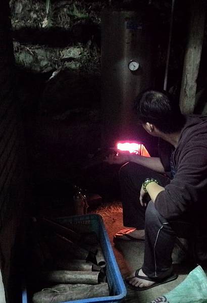 晚上要用鍋爐燒熱水洗澡,柴火熊熊的燃燒著,鍋爐上的溫度計緩緩爬升,