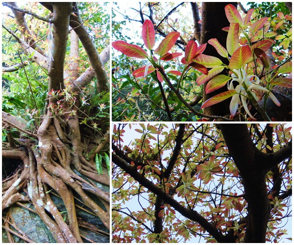 小溪旁有一顆百年老樹,盤根錯節的聳立著,有著楓紅似的葉子,像花瓣一樣的