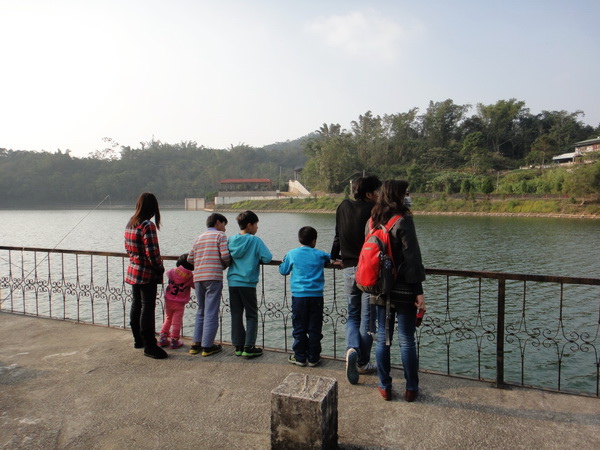水庫開放釣魚,兩兩三三的釣客正在耐心靜待著魚兒上鈎~~
