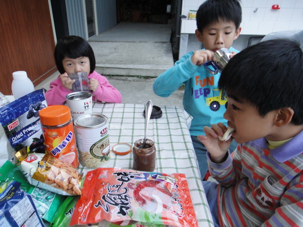 走完環湖步道,特別準備了在家鮮少供應的點心.....巧克力抹醬、可可熱飲及一堆零食,