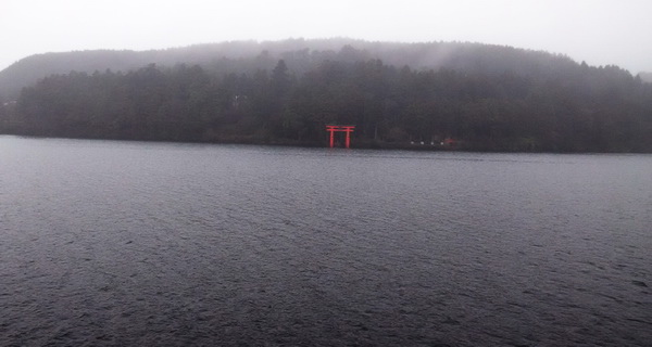 湖面上煙霧茫茫,富士山也消失在這片迷霧中,只看見遠方水面上紅色顯眼的[平和鳥居]