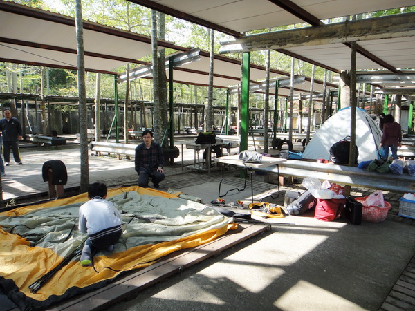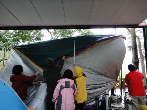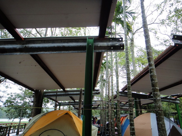 為了避開營位之間的樹,所以遮雨棚沒有相連著,外面下著雨,營位裏也下著雨了...
