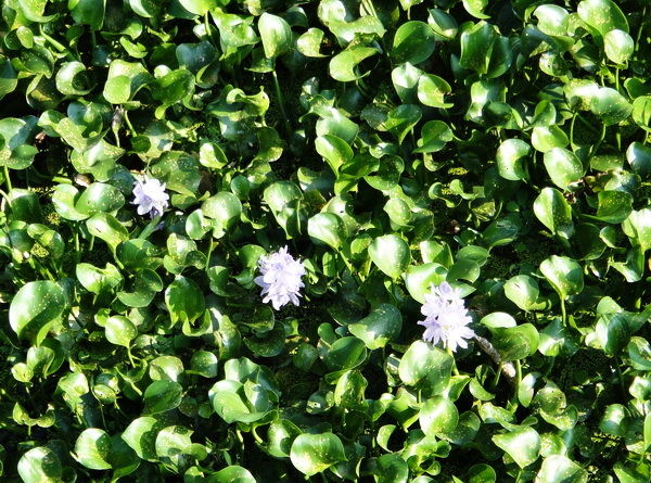 部份湖面飄浮著一大片開著紫色小花的布袋蓮,看似美麗,其實若湖面都被它完全