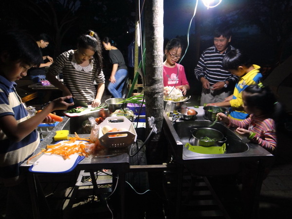 要張羅18人份的晚餐,大人小人鍋碗瓢盆齊飛,那頭在切菜,這頭在大火快炒中,大家都
